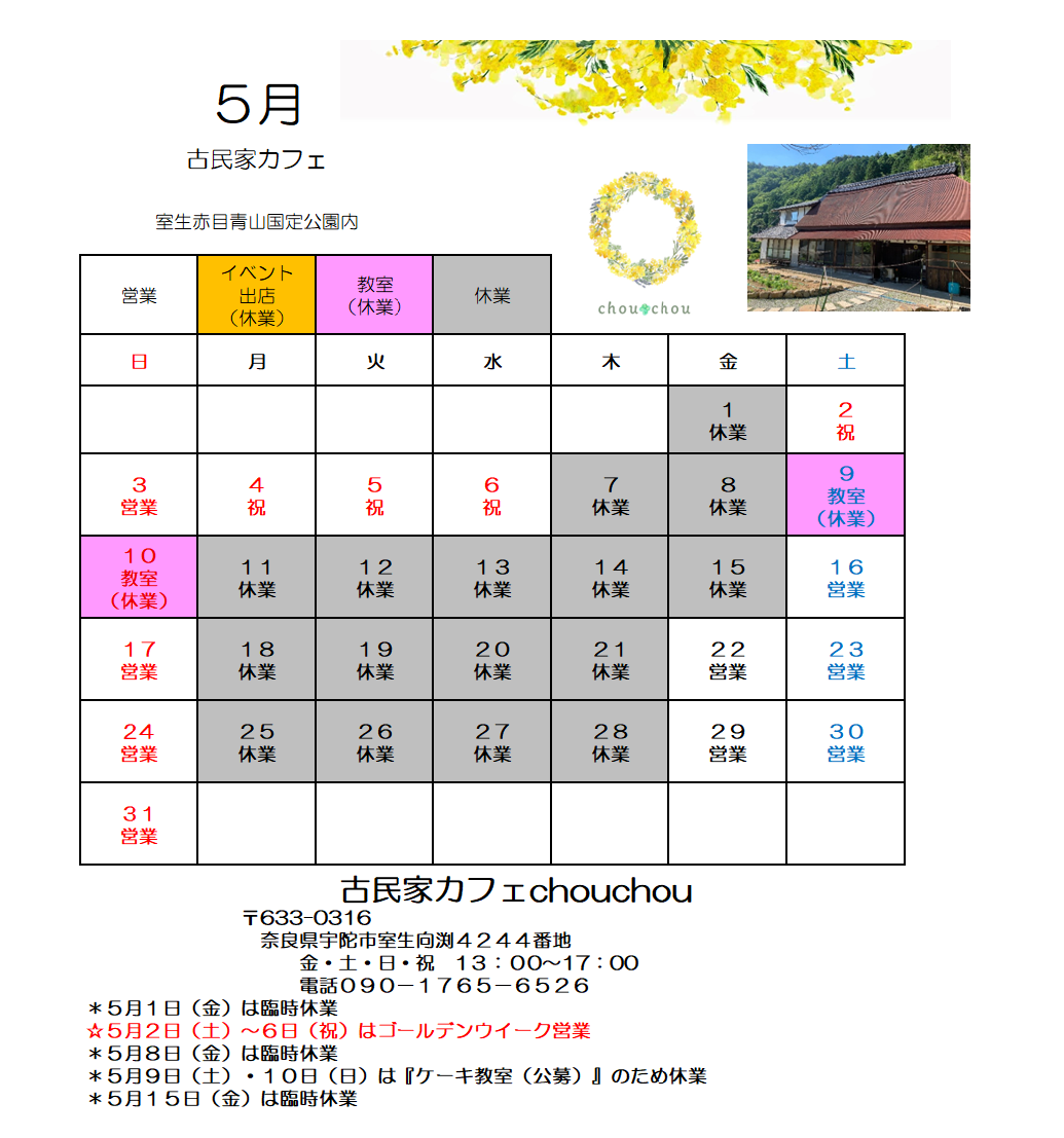 5月の「カレンダー」 2026/04/26 5月の営業カレンダーができました。 ≪5月の営業日≫ ☆5月1日(金)は臨時休業 ⭐5月2日(土)~6日(祝)はゴールデンウイーク営業 ☆5月8日(金)は臨時休業 ☆5月9日(土)・10日(日)は『ケーキ教室(公募)』のため休業 ☆5月15日(金)は臨時休業 ★営業カレンダーが変更する場合がございます。その場合は随時『お知らせ』いたします。
