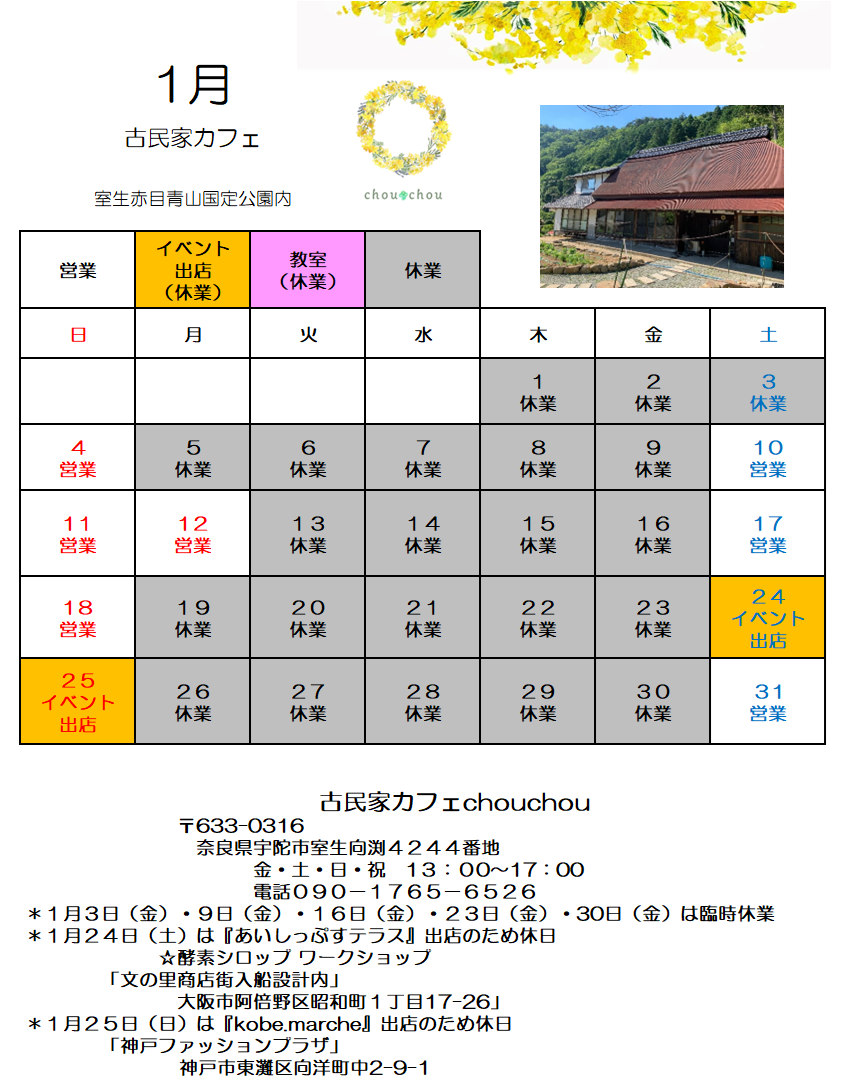 1月の営業カレンダーができました。